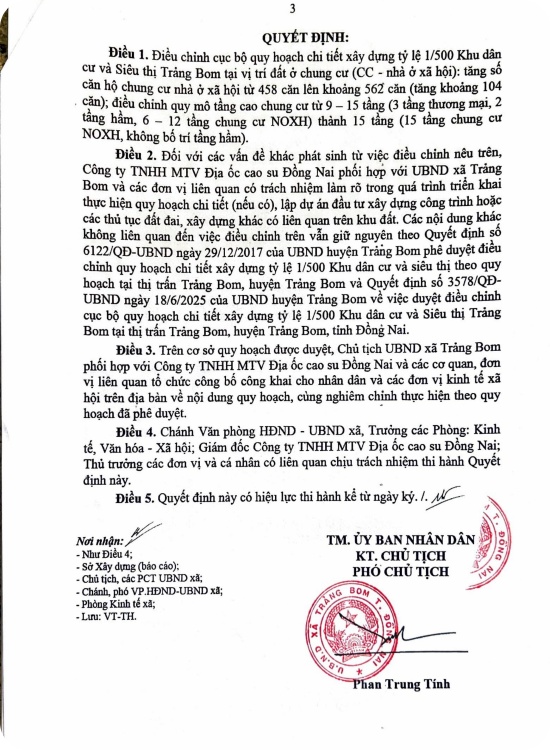 - Cập nhật mới nhất: Ngày 20/11/2025, UBND xã Trảng Bom đã ban hành Quyết định số 1654/QĐ-UBND về việc phê duyệt điều chỉnh cục bộ Quy hoạch chi tiết 1/500 Khu dân cư và siêu thị Trảng Bom.